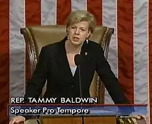 Baldwin was the first woman elected to Congress from Wisconsin. She was also the first openly gay non-incumbent elected to the House of Representatives, and the first open lesbian elected to Congress.[3][4] In 2008, Baldwin and Representative Barney Frank co-founded the Congressional LGBTQ+ Equality Caucus.[35]