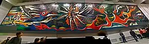 During his trip to Mexico in 1967, Okamoto painted a 5.5 x 30-meter mural in oil on canvas, entitled Asu no shinwa ("Myth of Tomorrow"), for the Hotel de Mexico in Mexico city by Manuel Suarez y Suarez that was being constructed for the 1968 Olympics.[26] The mural's subtitle is “Hiroshima and Nagasaki,” and accordingly the painting illustrates a landscape of nuclear destruction where a skeleton burns in red and emits pointed white protrusions. Surrounding images allude to events of nuclear disaster, such as the incident with Lucky Dragon #5.[27] The hotel was never completed and thus the mural was never installed or displayed. After being lost for 30 years in Mexico, on November 17, 2008, the mural was unveiled in its new permanent location at Shibuya Station, Tokyo.[28]