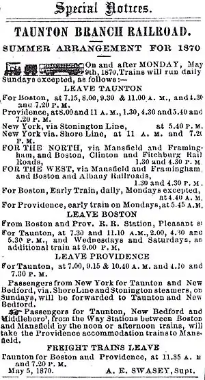 In 1871, the Taunton Railroad built a new connection to Attleboro, providing a shortcut to Providence.[7]