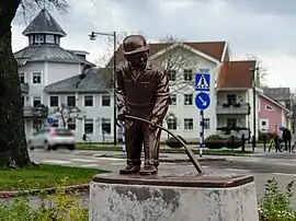 Carl Meijer did first make a model out of wood, then plaster, before casting it in massive grey iron and then placing it outside Vibro-Verket.[13] There it stood until Dynapac took over and moved it to the new facilities some hundred meters away. When Dynapac Ljungby was defunct in 2011, the association "Vibro-Verken Ljungby Historiska Sällskap" ["Vibro-Verken Ljungby Historical Society"] took over much of the company's material, such as the archives and the statue. In 2013 they donated the statue to Ljungby municipality which promised to place it at a suitable spot by the central plaza Stora Torg. One of the spots that were discussed was in the corner of Förningsgatan and Smedjegatan, another spot was by the Tellushuset. The statue did however remain stored.[12]