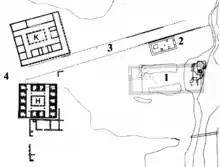 It overlooked the sacred way with a Doric portico which also continued along the L-shaped east side. Access was via a corridor, directly into the stoa or peristyle which overlooked by square rooms (5.1×5.1 m) on all four sides. The nearest comparison is with the Leonidaion of Olympia used as a hotel for delegations for the Olympic Games.[20]