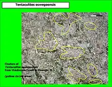 Tentaculites oswegoensis is a small animal of unresolved phylogenetic affinities that has often been classified with molluscs or even with marine worms and has recently been interpreted as a lophophorate based on shell microstructure. The genus Tentaculites was named in 1820 by von Schlotheim. Tentaculites oswegoensis was named by 1877 and is known from the Upper Ordovician rocks of the Maquoketa Group. It ranged from Oswego, IL (Kendall County) to possibly Kankakee River State Park (KRSP) in Will County, Illinois. At KRSP it appears in the basal Silurian of the Kankakee Formation but has not been found in the underlying Ordovician rocks.