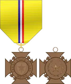 The Texas State Guard Service Medal is a campaign/service award of the Texas Military Department that may be issued to a service member of the Texas Military Forces.[1] There is no provision for subsequent awards.[2]