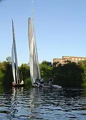 The rig is lofty, supported by standing rigging and usually by runners,[3] and the hull is a scow with metal centreplate.