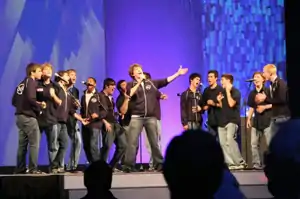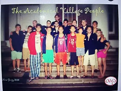 The Academical Village People (AVP) is an a cappella group at the University of Virginia founded in 1993 by a group of people who vowed to "never take themselves too seriously."[1] They set themselves apart from other groups by being able to keep professional while maintaining their lax attitude, wild antics while performing, and their less traditional uniform of a garage mechanic style shirt. The name "Academical Village People" comes from Thomas Jefferson's Academical Village at the university in Charlottesville, Virginia.[2] As of 2017, AVP, as it is often called for short, has released thirteen studio albums, including a greatest hits album, DECADEmical: Best of 1993-2003, of its first ten years in existence.[3] The group has recorded many notable performances such as opening for Dana Carvey[4] and Girl Talk, performing for Reba McEntire at the White House, concerts at the Kennedy Center, and performances in such countries as England, Spain, and Scotland.[5]