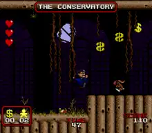 Puzzle-solving is also involved in saving the Addams family members. For example, Wednesday is found in an ice-themed freezing area and it is up to the player to figure out how to thaw her out, and Granny is trapped in a stove that's turned off by a switch the player must find.[6][7] The Amstrad CPC game has many doors that can only be unlocked by keys hidden throughout the mansion.[8] In most versions, the underground chambers must be activated to save Morticia; Lurch plays a tune in the Music Room that activates it, but only when Wednesday, Pugsley, Granny and Uncle Fester are rescued and meet up in the room.[9] In the NES version, Gomez has to collect $1,000,000 to save Morticia.[6] The Judge is the game's final boss.[1]