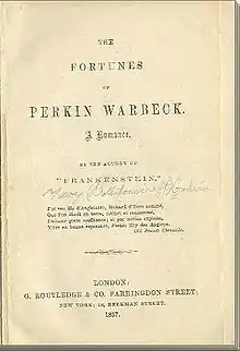 The Fortunes of Perkin Warbeck: A Romance is an 1830 historical novel by Mary Shelley about the life of Perkin Warbeck. The book takes a Yorkist point of view and proceeds from the conceit that Perkin Warbeck died in childhood and the supposed impostor was indeed Richard of Shrewsbury. Henry VII of England is repeatedly described as a "fiend" who hates Elizabeth of York, his wife and Richard's sister, and the future Henry VIII, mentioned only twice in the novel, is a vile youth who abuses dogs. Her preface establishes that records of the Tower of London, as well as the histories of Edward Hall, Raphael Holinshed, and Francis Bacon, the letters of Sir John Ramsay to Henry VII that are printed in the Appendix to John Pinkerton's History of Scotland[1] establish this as fact. Each chapter opens with a quotation. The entire book is prefaced with a quotation in French by Georges Chastellain and Jean Molinet.