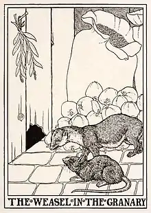 One of the earliest appearances in English sources was in John Ogilby's editions of Aesop's fables in which a fox becomes trapped in a larder and is advised by a weasel that is also present there.[4] In Sir Roger L'Estrange's retelling only a few decades later, the fox is trapped in a hen-roost and receives the advice from a weasel that is passing outside.[5] Samuel Croxall tells his moralised story of ‘a little starveling, thin-gutted rogue of a mouse‘ who, rather more plausibly than Horace's fox, creeps into a corn basket and attracts a weasel with its cries for help when it cannot get out.[6] More or less the same story was told at the start of the following century by Brooke Boothby in verse[7] and Thomas Bewick in prose.[8]