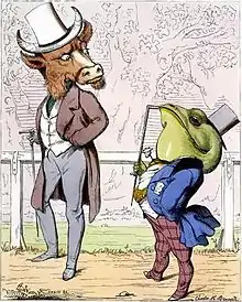 The fable was a favourite in England and was put to popular use on 18th century china by the Fenton pottery[13] and in the 19th century by the Wedgwood pottery. This was on its Aesop series of coloured plates, signed by Emile Lessore in the 1860s.[14] Minton's pottery also used the fable on a series of Aesop tiles a little later. In France a biscuit porcelain figure group illustrating the fable was issued by the Haffreingue porcelain factory at Boulogne between 1857–1859. The ox is modeled lying on the ground and looking down at the frog directly in front.[15]