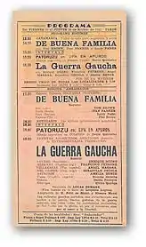 The Gaucho War (La guerra gaucha) is a 1942 Argentine historical drama and epic film directed by Lucas Demare and starring Enrique Muiño, Francisco Petrone, Ángel Magaña, and Amelia Bence. The film's script, written by Homero Manzi and Ulyses Petit de Murat, is based on the novel by Leopoldo Lugones published in 1905. The film premiered in Buenos Aires on November 20, 1942 and is considered by critics of Argentine cinema to be one of the most successful films in history.[1] It won three Silver Condor awards, including Best Film,[2] Best Director (Lucas Demare),[3] and Best Adapted Screenplay (Ulises Petit de Murat and Homero Manzi),[3] given by the Argentine Film Critics Association at the 1943 Argentine Film Critics Association Awards for the best films and performances of the previous year.