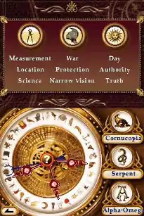 Another major aspect of the gameplay is the alethiometer (a rare truth-telling device which features in the novels). Once the player has access to the Alethiometer, it can be asked certain set questions. The device has thirty-six symbols on its outer edge, each with three meanings. These meanings are discovered over the course of game; some are learned automatically as the plot advances, others must be sought out by the player and can be missed. For each question, Lyra is given three words, and each word is assigned a hand on the Alethiometer. If Lyra knows the corresponding symbol of a given word, the hand automatically turns to the correct symbol. Words she doesn't know must be guessed by the player. When the three hands are all pointing at symbols, the player confirms the selection and Lyra asks the question. A balancing minigame then begins, where the player must press buttons corresponding to the on-screen display. The more symbols which were correctly identified in the first part of the game, the easier the balancing game is. If the player successfully completes the balancing game, the Alethiometer will answer the question.[12][15][16]