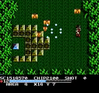 Gameplay varies depending on the player's location within Naju. The player controls the Guardian in humanoid form when exploring the surface of Naju (the Labyrinth) and in spaceship form when investigating Naju's interior (the Dungeon).[1]:10 The Guardian has a life meter that decreases after sustaining damage from enemies; it can be replenished by collecting various items. If the life meter runs out, the Guardian explodes, and the game ends.[1]:7 The player can use a primary rapid-fire weapon with unlimited ammunition as well as various powerful secondary weapons that consume "power chips" with each use.[1]:6 Power chips are also used as currency to purchase upgrades for the Guardian in a handful of shops throughout Naju. Found within the Labyrinth or obtained after defeating a boss, these upgrades include primary weapon improvements, new or upgraded secondary weapons, and round, brightly colored creatures called Landers.