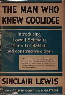 The Man Who Knew Coolidge is a 1928 satirical novel by Sinclair Lewis. It features the return of several characters from Lewis' previous works, including George Babbitt and Elmer Gantry. Additionally, it sees a return to the familiar territory of Lewis' fictional American city of Zenith, in the state of Winnemac. Presented as six long, uninterrupted monologues by Lowell Schmaltz, a travelling salesman in office supplies, the eponymous first section was originally published in The American Mercury in 1927.[2]