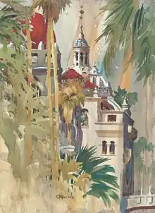 The property began as an adobe boarding house called Glenwood Cottage, built by engineer/surveyor Christopher Columbus Miller and on November 22, 1876, the Millers took their first paying guest. In February 1880, Miller's son Frank Augustus Miller purchased the hotel and land from his father. It became a full-service hotel in the early 1900s due to California's economic citrus boom and warm weather, attracting wealthy travelers and investors from the East Coast and Europe.[4] In 1902, Frank changed the name to the "Glenwood Mission Inn" and started building, in a variety of styles, until he died in 1935.