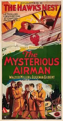 The Mysterious Airman (a.k.a. Mysterious Airman and The Mystery Airman ) is a 1928 American black-and-white 10-chapter silent film serial from Weiss Brothers Artclass Pictures.[1] The serial involves a mysterious airman who is after the aviation inventions from a new aircraft company.[2]The Mysterious Airman was one of the last Hollywood silent film serials and, until recently, thought to be a lost film.[3]