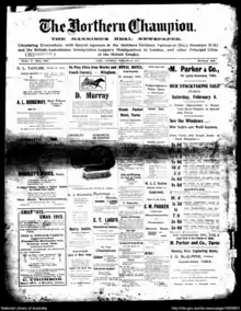 The Northern Champion was first published on 2 February 1912 by David A. Cowan.[1] Mary Lucy Cowan (1872-1950) became proprietor and manager of the Northern Champion after the death of her brother David Cowan in 1922.[2] In 1961 the Northern Champion was absorbed into the Manning River Times.[3]