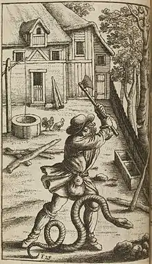 In Marie de France's verse account at the close of the 12th century, the snake asks the farmer for a daily ration of milk and promises him enrichment. He is later persuaded by his wife to kill it and waits by its hole with an axe but only cleaves the stone at its entrance. The snake kills the man's sheep in revenge and when he asks for pardon tells him that he can no longer be trusted. The scar in the rock will always be a reminder of his bad faith. The moral on which Marie ends is never to take a woman's advice.[6] The broad outlines remain the same in the story that appears in the Gesta Romanorum a century later. A knight in debt makes a bargain with a serpent and is similarly enriched. When he is persuaded to treachery by his wife, the serpent kills his child and he is reduced to poverty. It is interpreted there as an allegory of sin and false repentance.[7]