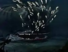 In the 1940 Walt Disney film Pinocchio, the Dogfish is named Monstro (which is Portuguese, Esperanto, and archaic Italian for "monster") and is portrayed as a gigantic, sadistic, terrible, aggressive, intelligent, vicious, man-eating sperm whale, in contrast with the "gentle giants of the sea" in real life, with massive jaws, both of which have sharp teeth, and a grooved underside like a rorqual. He is first mentioned by Jiminy Cricket in a message from the Blue Fairy about Geppetto, who, sailing to find Pinocchio, has been swallowed by him.[1] They search for him, but are frustrated upon mentioning his name to the sea creatures, which causes them to flee in terror. After finally discovering him asleep, he suddenly awakens upon noticing a school of tuna swimming nearby and gives chase, eventually swallowing them and Pinocchio (but not Jiminy) before closing his mouth and falling asleep again. Inside his belly, Pinocchio discovers and reunites with Geppetto before suggesting that they start a fire in order to make Monstro sneeze them out, though Geppetto fears that this plan would make Monstro mad. The smoke wakes him up, prompting him to sneeze them out of his mouth. Unfortunately, just as Geppetto feared, this serves only to infuriate him after drinking lots of water to put the fire out, and he pursues them, using surprise attacks in attempts to kill them, but fails. Eventually, when Pinocchio pulls Geppetto into a hole in a cliff, Monstro leaps into the air, aiming to reconsume them, but ends up smashing against the cliff on impact. It is unknown what exactly happened to him, but, due to smashing against the cliff, he was apparently killed by the impact.[2]