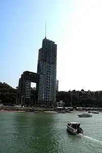 The Waterfront Suites and Residence (Thai: วอเตอร์ฟรอนท์สวีทแอนด์เรสซิเดนซ์) is an unfinished and abandoned condominium located on Chalermphrakiat road in Pattaya, Chonburi province, Thailand. Standing at 53 stories high, the building began development in 2011 but was halted in 2014. The building has an area of 38,530 m2,[1] and was designed to stand at 57 stories.[2] The building has commonly been described as an "eyesore".[3]