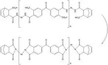 Formed by the condensation reaction of a diamine with maleic anhydride, and processed basically like epoxy resins (350 °F (177 °C) cure).[6] After an elevated post-cure (450 °F (232 °C)), they will exhibit superior properties. These properties are influenced by a 400-450 °F (204-232 °C) continuous use temperature and a glass transition of 500 °F (260 °C).