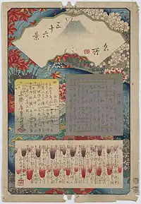 Thirty-six Views of Mount Fuji (Japanese: 富士三十六景, Hepburn: Fuji Sanjū-Rokkei) is the title of two series of woodblock prints by Japanese ukiyo-e artist Hiroshige, depicting Mount Fuji in differing seasons and weather conditions from a variety of different places and distances. The 1852 series, published by Sanoya Kihei, are in landscape orientation using the chūban format, while the 1858 series are in the portrait ōban format and were published by Tsutaya Kichizō.[1][2] The same subject had previously been dealt with by Hokusai in two of his own series, Thirty-six Views of Mount Fuji, produced from c. 1830 to 1832,[3] and One Hundred Views of Mount Fuji, published in three volumes from 1834 to 1849.[4]