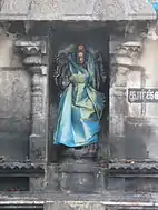 This temple is situated in Magaral, a village in Kanchipuram district, located 12 km from Uthiramerur on the Uthiramerur - Kanchipuram highway. The temple is located on the northern banks of Cheyyar River.[2] The nearest railway station is at Kanchipuram and the nearest airport is Chennai International Airport. The Shiva temple at Magaral is spread over an area of 2 acres (8,100 m2). The main rajagopuram is on the east side with seven tiers and pierces the large rectangular granite walls. The temple tank, Indra Theertha, is located inside the main entrance. The temple is built on an elevated platform and there are two corridors inside the temple. At the main entrance, the sculptures of Ganapathy and Muruga can be found on both the sides. The main shrine accommodates the image of Shiva known as Thirumakaraleeswarar in the form of Lingam, of the size of the tail of an iguana. There is a separate shrine for Balambigai to the right of Thirumakaraleeswarar's sanctum. The first precinct on the four sides of the sanctum sanctorum are decorated with the images of Nayanmars, Navagrahas, Bhairava, Murugan Sannadhi in the northwest and Durga Sannadhi on the northeast. The vimana of the temple is called Gajabrusta in model, replicating the hip of an elephant.[1]