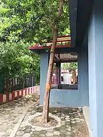The temple's sthala vriksham (sanctum tree) is the iluppai or butter tree (Madhuca indica), grown near the original tree of the same species under which, according to tradition, Valluvar was found as a baby by his foster parents.[3][10][11] The locals believe that this is where Valluvar was born.[7] A chamber is built around the original tree.[2] A Valluvar statue in yoga position holding a palm leaf manuscript of the Tirukkural sits on the pedestal around the original tree.[7] A pedestal was built around the remains of the original tree in 1935 and is now braced up with copper sheets.[10][19][14] The pedestal additionally holds an idol representing the feet of Valluvar made of black granite, along with the statues of Valluvar and his parents, Sri Adhi and Sri Bhagavan, with Adhi holding the baby Valluvar in her arms.[7][10][14] Renovation of the temple began on 27 April 1973. Holy consecration (Kumbabishekam) of the temple took place on 23 January 2001.[19] The temple comes under the purview of the nearby Mundakakanniamman temple and is under the ambit of the Hindu religious charity department of the Government of Tamil Nadu.[19] There is also a library within the temple campus.[19] A community centre named "Valluvar–Vasuki Community Hall" has been built near the temple.[19] The temple also serves as the venue for meetings of Tamil language enthusiasts.[11] Classes on the Tirukkural are also held in the evenings for children.