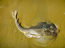 The thornback guitarfish (Platyrhinoidis triseriata) is a species of ray in the family Platyrhinidae, and the only member of its genus. Despite its name and appearance, it is more closely related to electric rays than to true guitarfishes of the family Rhinobatidae.[2] This species ranges from Tomales Bay to the Gulf of California, generally in inshore waters no deeper than 6 m (20 ft). It can be found on or buried in sand or mud, or in and near kelp beds. Reaching 91 cm (36 in) in length, the thornback guitarfish has a heart-shaped pectoral fin disc and a long, robust tail bearing two posteriorly positioned dorsal fins and a well-developed caudal fin. The most distinctive traits of this plain-colored ray are the three parallel rows of large, hooked thorns that start from the middle of the back and run onto the tail.
