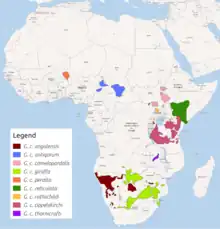 Thornicroft's giraffe (Giraffa camelopardalis thornicrofti), also known as the Rhodesian giraffe or Luangwa giraffe, is a subspecies of giraffe. It is sometimes considered a species in its own right (as Giraffa thornicrofti)[2] or a subspecies of the Masai giraffe (as Giraffa tippelskirchi thornicrofti).[3][4][5] It is geographically isolated, occurring only in Zambia’s South Luangwa Valley.[6] An estimated 550 live in the wild, with no captive populations. Its lifespan is 22 years for males and 28 years for females.[7] The ecotype was originally named after Harry Scott Thornicroft, a commissioner in what was then North-Eastern Rhodesia and later Northern Rhodesia.