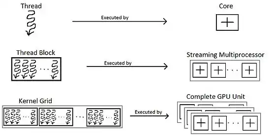 Although we have stated the hierarchy of threads, we should note that, threads, thread blocks and grid are essentially a programmer's perspective. In order to get a complete gist of thread block, it is critical to know it from a hardware perspective. The hardware groups threads that execute the same instruction into warps. Several warps constitute a thread block. Several thread blocks are assigned to a Streaming Multiprocessor (SM). Several SM constitute the whole GPU unit (which executes the whole Kernel Grid).