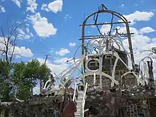 The site covers five acres on the south side of a 1,000-foot stretch of Interstate 80. There were originally seven buildings, including a three-story hostel where many hippies stayed in the 1970s.[4] Three stone and concrete buildings remain, and more than 200 concrete sculptures depicting Native Americans and their protective spirits, massacres, and injustices against them. Thunder Mountain Monument (or Park) is replete with found objects, such as car hoods, dolls' heads, typewriters, and gas pumps, many of which are incorporated into the buildings themselves; the third floor has one wall made up of antique bottles which form a stained glass window of a different sort; other floors have windows from antique windshields and bottles incorporated therein to provide a lighting source; one framework forms a large handle so the Great Spirit could take the building away after Thunder's death.[5]
