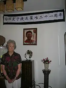 The Tiananmen Mothers (Chinese: 天安门母亲) is a group of Chinese democracy activists promoting a change in the government's position over the 1989 Tiananmen Square protests and massacre. It is led by Ding Zilin, a retired university professor whose teenage son was shot and killed by government troops during the protests. The group – comprising the parents, friends and relatives of victims of the massacre – formed in September 1989 when Ding, along with her husband Jiang Peikun, met another mother, Zhang Xianling, whose 19-year-old son was also killed on June 4, 1989.[1] As well as campaigning, the group also disseminates information about the events to the public, including through the internet.[1] Currently, the group consists of relatives of 125 individuals killed during the protests.[2] For her efforts, Ding has been hailed as an "advocate for the dead".[3]