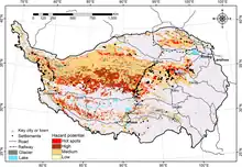 Outside of the Arctic, Qinghai–Tibet Plateau (sometimes known as "the Third Pole"), also has an extensive permafrost area. It is warming at twice the global average rate, and 40% of it is already considered "warm" permafrost, making it particularly unstable. Qinghai–Tibet Plateau has a population of over 10 million people – double the population of permafrost regions in the Arctic – and over 1 million m2 of buildings are located in its permafrost area, as well as 2,631 km of power lines, and 580 km of railways.[45] There are also 9,389 km of roads, and around 30% are already sustaining damage from permafrost thaw.[46] Estimates suggest that under the scenario most similar to today, SSP2-4.5, around 60% of the current infrastructure would be at high risk by 2090 and simply maintaining it would cost $6.31 billion, with adaptation reducing these costs by 20.9% at most. Holding the global warming to 2 °C (3.6 °F) would reduce these costs to $5.65 billion, and fulfilling the optimistic Paris Agreement target of 1.5 °C (2.7 °F) would save a further $1.32 billion. In particular, fewer than 20% of railways would be at high risk by 2100 under 1.5 °C (2.7 °F), yet this increases to 60% at 2 °C (3.6 °F), while under SSP5-8.5, this level of risk is met by mid-century.[45]