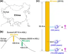 Ice of the plateau provides a valuable window to the past. In 2015, researchers studying the Plateau reached the top of the Guliya glacier, with ice thickness of 310 m (1,020 ft), and drilled to a depth of 50 m (160 ft) in order to recover ice core samples. Due to the extremely low biomass in those 15,000-year-old samples, it had taken around 5 years of research to extract 33 viruses, of which 28 were new to science. None had survived the extraction process. Phylogenetic analysis suggests those viruses infected plants or other microorganisms.[41][42]