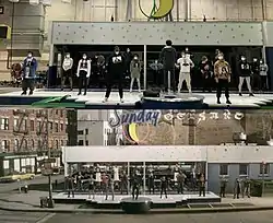 For "Sunday," which parodies the Act 1 finale of the same name from Sondheim's Sunday in the Park with George, the team set up the sequence as a deliberate contrast to the look of the rest of the film, as it is Larson's "wildest dream." This included the idea to turn the Moondance Diner into a proscenium stage by having the front come down, and overexposing the footage to resemble a painting, especially with the transition to a pointillist look at the very end of the song.[42] The song had only ever been performed by Larson himself during his lifetime, so Miranda wanted to depict Larson's "dream choir" for the pivotal sequence.[53] This included the actors who inspired him, particularly Peters for her role in Sunday in the Park with George, but also his future collaborators in Pascal, Rubin-Vega, and Heredia, as well as cast members from shows that Miranda considers "direct descendants" of Larson's work: Malone appears dressed as Big Alison from Fun Home, while Goldsberry and Soo wear the colors and strike the pose of the Schuyler sisters from Miranda's own Hamilton.[50] Miranda also recruited Michael Starobin, who orchestrated Sunday in the Park with George, to achieve the sound of the Sondheim parody.[54] The scene was shot under heavy COVID protocols, particularly for some of the older actors. Miranda's cameo in the scene was written for Chip Zien and Joanna Gleason, who starred in the original Broadway cast of Sondheim's Into the Woods, but COVID restrictions prevented them from appearing.[53]