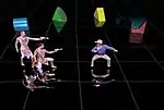 Time Traveler has a non-standard shape for an upright arcade cabinet. Though the game is played standing up, the cabinet is larger and shorter resembling an oversized cocktail design (50"H x 43"W x 45"D) (127 cm x 109.2 cm x 114.3 cm) weighing 370 lb (170 kg). It doesn't have a monitor but instead uses a flat, dark stage called the "Micro-theater",[1] which was invented by engineers Steve Zuloff and Barry Benjamin. The Micro-theater is composed of a big concave mirror that lies underneath the stage. This holographic mirror-like optical device was invented by the Japanese firm Dentsu.[4] Along with it, a 20-inch (50.8 cm) Sony TV sits in front of the mirror. The player controls are located on top of the TV equipment. Several neon colored geometric blocks placed at the back of the stage serves as the only background for the game. It is decorated with white formica all around and with a tall "SEGA Hologram Time Traveler" sign on its back.