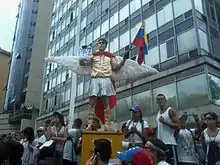 • 20 February – The removal of María Corina Machado's parliamentary immunity is requested in the National Assembly.[86][87][88][89][90] The minister of Electric Energy, Jesse Chacón, denounced vandal acts to the property of the National Electric System in the Anzoátegui, Bolívar and Carabobo states.[91] The charges of terrorism and homicide of Leopoldo López are suspended.[92] In response to the death of Miss Tourism Venezuela Génesis Carmona, groups of women planned to defend the family of Génesis and protest her killing on 22 February.[93] A citizen in the Mérida state dies after sustaining fatal wounds while crossing a barricade with barbed wire in a motorcycle with one of her children.[94]