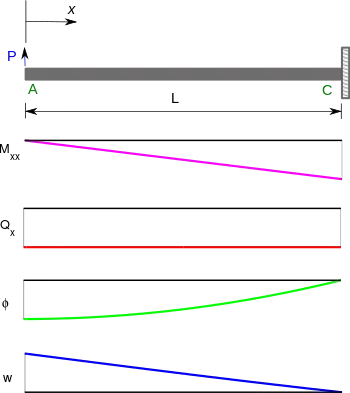 Let us assume that the clamped end is at and the free end is at . If a point load is applied to the free end in the positive direction, a free body diagram of the beam gives us