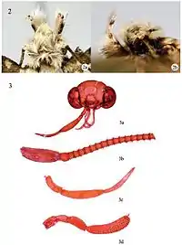 Head structure of T. indica, ♂. 2 Head with scales: 2a dorsal view; 2b lateral view; 3 Head scales removed: 3a head, slide No. NKYLL012; 3b antenna; 3c labial palpus; 3d maxillary palpus