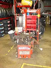 The mount/demount mechanism consists of the duckhead, swing arm, and vertical slide. The duckhead is at the bottom end of the vertical slide. The duckhead is uniquely shaped, like a tapered bill, to fit next and surround the rim of a wheel. It can either be made of metal or plastic. The duckhead mounts and demounts the tire from the wheel.[2] The swing arm moves left and right. The purpose of the swing arm is to move the duck head near or away from the rim. The last component of the mount/demount mechanism is the vertical slide. The vertical slide moves up and down so that the duck head can fit onto the rims of different size wheel widths. The vertical slide has a spring and locking handle above the swing arm to set the duckhead and maintain a stable position around the rim.[2]
