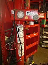 The air pressure system on a tire changer provides the air to inflate tires mounted on wheels. The air pressure system consists of 4 components: air hose, air inflation gauge, inflation pedal and manual pressure bleed valve. The air hose is located near the top of the tire changer, and it allows compressed air to travel into the tire. A specialized end is used on the air hose to clamp firmly onto valve stems of the wheels. The air inflation gauge displays the air pressure within the tire when the air hose is connected to the valve stem. The air inflation gauge displays the pressure in pounds per square inch (psi). Directly below the air hose on the side of the tire changer is the inflation pedal that enables the inflation of the tire.[2] When the inflation pedal is raised, a burst of air is released from valves next to each rim clamp toward the bottom bead of the tire to help with inflation. The manual bleed valve is located next to the air hose and air inflation gauge. The manual bleed valve allows the manual release of air pressure from tire.[2]