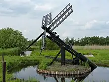 The paaltjasker was built in 1977 by Jac. Punter of Paaslo as a copy of the above-mentioned tjasker built by Dijksma.[13] It was repaired and moved about 200 m in 1984. The tjasker is close to the Staatsbosbeheer visitor centre of nature reserve De Weerribben near Ossenzijl and is used to pump water into the reed beds in summer. The tjasker has four symmetrical Common sails that can be covered with wooden slats and which have a span of 5.55 metres (18 ft 3 in).[14][15]