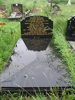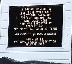 His funeral held on 19 January 2000 was attended by thousands, with Williams buried at Milltown Cemetery.[6] Joe Cahill, Tom's cell mate, and John Oliver, sentenced to death with Tom but later reprieved, as well as Madge McConville, who had been arrested with Tom, Greta McGlone, Billy McKee, Eddie Keenan and perhaps least known, Nell Morgan, Tom's girlfriend at the time of his death, were all present. Six senior Sinn Féin members including Gerry Adams were also present in St Paul's Church on the Lower Falls Road for the Mass. Tom's boyhood friend and the man who introduced him to the Republican Movement, Alfie Hannaway, was unable to attend the funeral due to ill health.[7] Tom's funeral Mass was celebrated by Rev Fr Paddy O'Donnell, C.Ss.R., a Redemptorist Priest from Clonard Monastery.