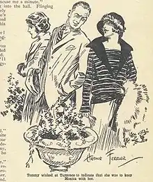 ![]() Illustration by Arthur Ferrier of Tommy and Tuppence from the December 1923 issue of The Grand Magazine and the first-known image of the characters | |