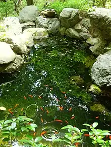 The garden is centered on a pond and uses the natural terrain of the Musashino Plateau by incorporating the valleys found in the terrace cliffs into its design.[3] The highlight is the strikingly different types of landscape: a scenic spacious lawn on the top,[3] steep slopes, a pond with waterfalls and bamboo forest at the bottom.[5] There is a depression in the pond containing a natural spring called Jiro Benten that provides large quantities of fresh water.[5] Water that runs off the cliff is a part of the source of the Nogawa River.[3] A tea house called Koyo-tei is also situated in the gardens.[5]