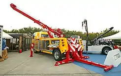 • Boom: uses an adjustable boom with a winch to recover vehicles from a ditch, over an embankment, or any place the vehicle cannot be safely reached by backing up. Some booms are fixed; some use heavy pivoting A-frames; others are equipped with hydraulic-powered telescopic cylinders. The heaviest types of boom can rotate, effectively turning the tow truck into a sort of mobile crane, called a "rotator", and are usually reserved for incidents involving heavy vehicles.[3] In the past, boom trucks used a "hook and chain" system where chains are looped around the vehicle frame or axle, then lifted by a boom winch. A towbar with heavy rubberized mats connects the truck and vehicle, so it can be towed on its other axle. "Slings" and "belt lifts" are a further development, with rubber straps replacing part of the chains.[4][5][6] Slings are not used much today because they can scratch the bumpers of cars. However, they are sometimes used for towing vehicles that have been in an accident or have one or two of the front or rear wheels missing, or for pickup trucks and other vehicles that have steel bumpers. Cars equipped with all-wheel drive cannot be towed with a sling, as it can cause problems with the car's drivetrain.[7]