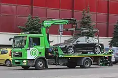 • Lift flatbed: a boom uses a wheel-lift frame to lift the vehicle vertically and load it on the bed. This type of truck can remove vehicles that are parallel-parked. It is commonly used in Europe.