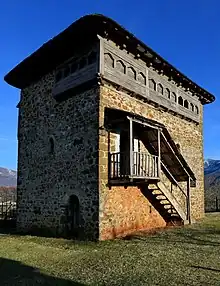 In Kosovo the traditional two- or three-storey kullas were built mainly between the 18th century and the early part of the 20th century.[18] They are constructed entirely of locally excavated stone, though some incorporate decorative wooden elements in the upper floors. Historically the kullas have been inhabited solely by men, with women and children housed in a connected annexe. The exterior walls are a meter thick at ground level but become thinner towards the roof. The small openings that play the role of windows are called frëngji,[19] and their tiny size is due to the kulla's historical use as a fortification and as a means of protection against attacks.[19]