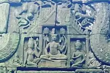 In Angkorian period, palaces were built in various locations such as on Kulen mountain (Mahendrapavarta), Hariharalaya, Koh Ker (Lingapura), and Angkor (Yasodharapura). Palace and royal residences at Angkor were undoubtedly one of the largest wooden structures in the capital and none of the structures survived today. However, Chinese emissary to Angkor in 13th century described the palace as a series of commanding buildings covered with lead tiled roofs. Bas reliefs at Bayon and Banteay Chhmar also depicted several wooden buildings with triangular pediments and roofs considered as the royal halls of Angkorian palaces[4]