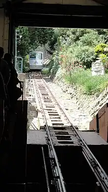 The Funicular to Monserrate is a tramway used for going from the city level (2,962 m or 9,718 ft above sea level) to the top of the Hill of Monserrate (3152 m). The 1,000 mm (3 ft 3+38 in)[1] gauge funicular transports daily the inhabitants of the capital and tourists; it was finished in 1928 and inaugurated officially on August 18, 1929. Since that time, this small train has slowly ascended towards the peak of Monserrate, gradually allowing its passengers the contemplation of nature and landscape that is being left behind as they reach the 3,152 meters or 10,341 ft above sea level, where its upper station lies.